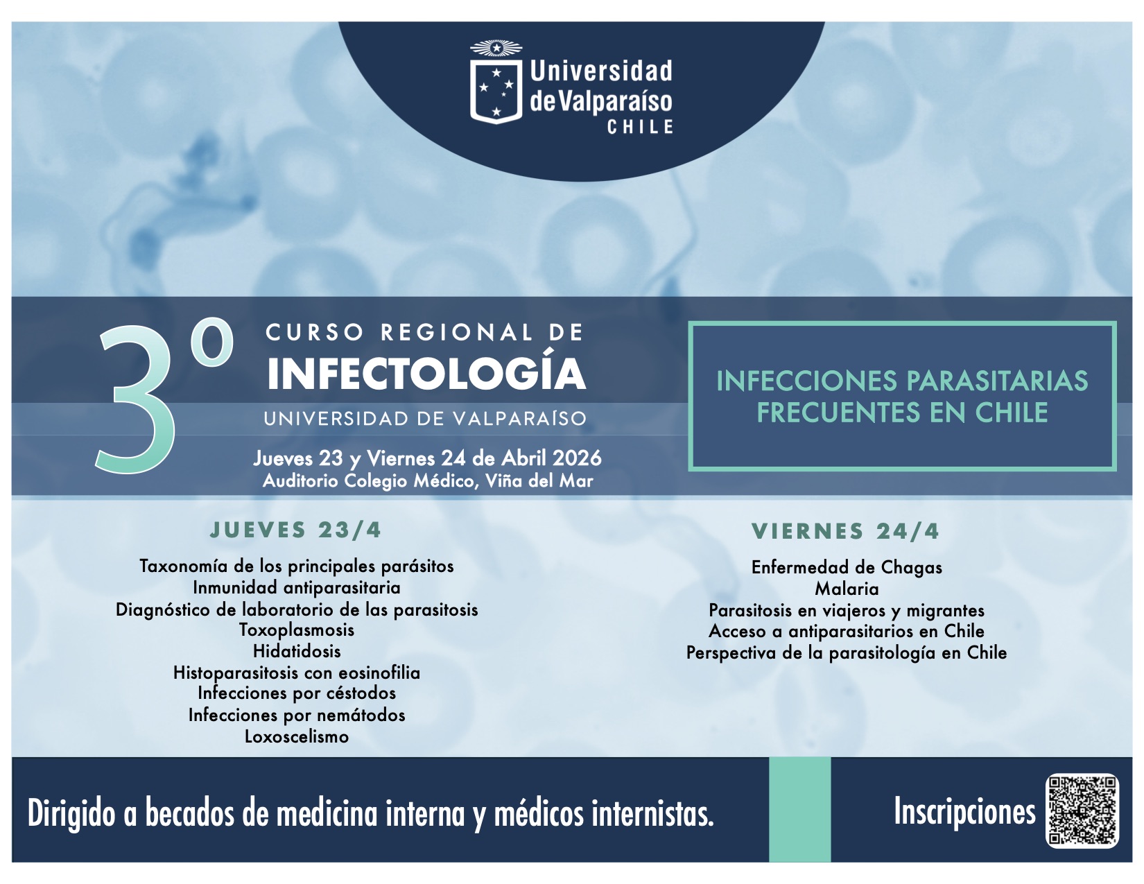 El Departamento de Medicina Interna de la Escuela de Medicina de la Universidad de Valparaíso invita al 3° Curso Regional de Infectología UV, que se realizará los días 23 y 24 de abril en el Auditorio del Colegio Médico, en Viña del Mar.