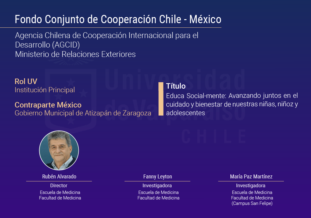 Gracias al Fondo Conjunto de Cooperación Chile-México, de la Agencia Chilena de Cooperación Internacional para el Desarrollo (AGCID) del Ministerio de Relaciones Exteriores, la Escuela de Medicina UV podrá desarrollar el proyecto Educa Social-Mente en Atizapán de Zaragoza en Ciudad de México.